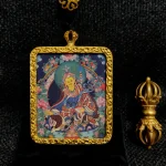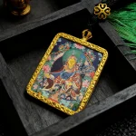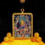 Padmasambhava, also known as Guru Rinpoche, sits solemnly in a seated posture, his gaze serene and majestic. He wears a magnificent robe and a lotus hat, holding a vajra in his right hand and a skull bowl in his left, symbolizing control over samsara and wisdom. A kawakta staff rests on his shoulder, representing his consort and the union of wisdom and compassion. In Tibetan Buddhism, he symbolizes “removing obstacles and opening wisdom.” This Thangka pendant encapsulates his solemn image within a small space, continuing the religious and artistic value of Thangkas while serving as a portable spiritual talisman for believers, thus embodying the dual significance of cultural transmission and faith.