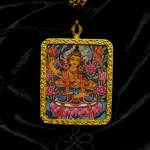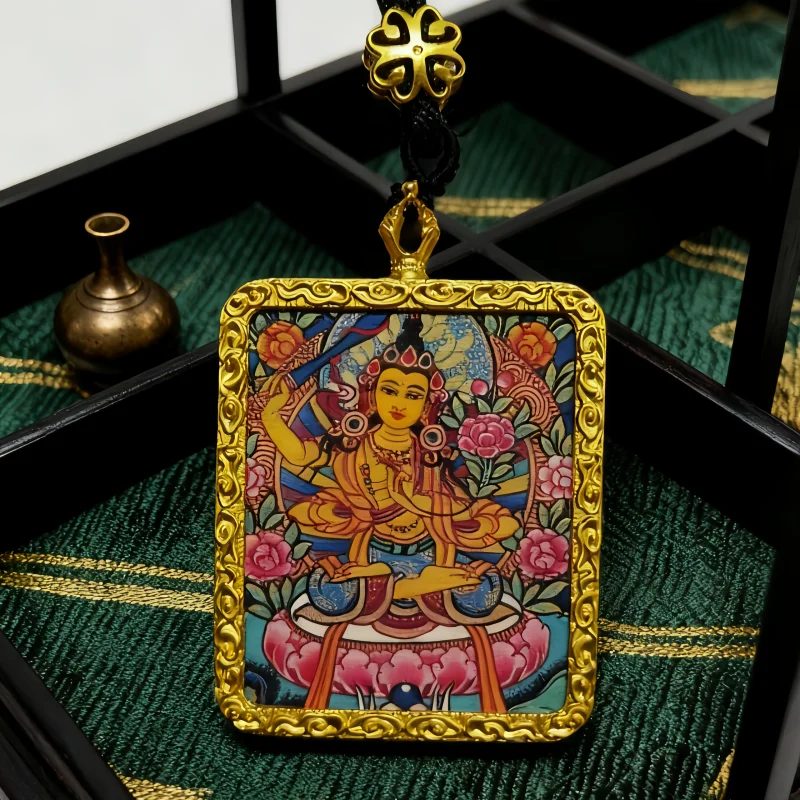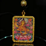 In terms of craftsmanship, this Thangka pendant employs traditional Thangka hand-painting techniques, delicately outlining Manjushri Bodhisattva’s solemn image with natural mineral pigments. The gold border and vibrant floral patterns further emphasize his sacred wisdom. It can serve as an important amulet for Tibetan Buddhist believers seeking increased wisdom and academic success.