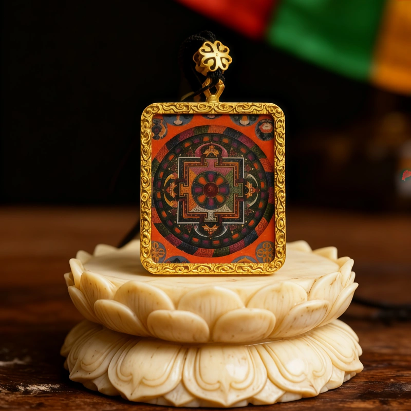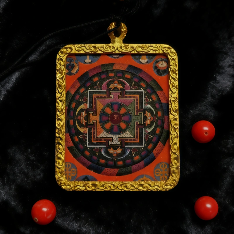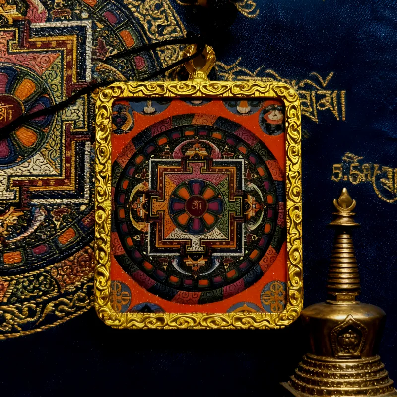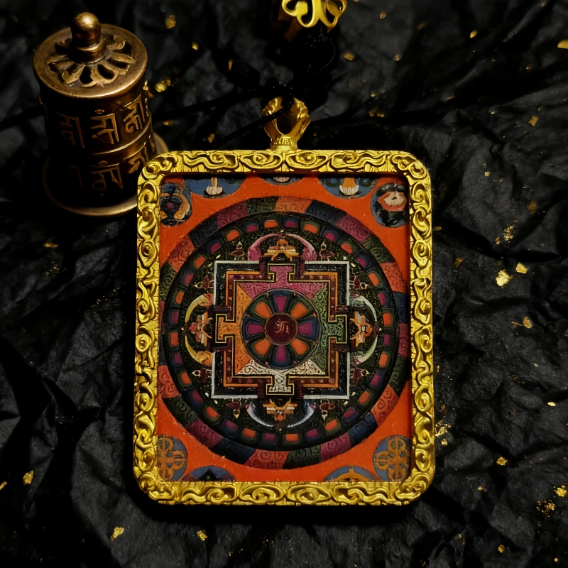 The creation of the Vairocana Mandala Thangka follows traditional Thangka techniques, using natural mineral pigments and gold powder to meticulously outline the design. The patterns are intricate yet orderly, with dignified and durable colors. It embodies both religious solemnity and unique artistic aesthetics, representing a deep fusion of faith and craftsmanship. Wearing a Mandala Thangka pendant is believed to protect the wearer, purify the mind, enhance wisdom and understanding, protect against evil forces, and ensure peace and health.