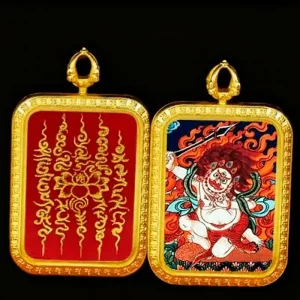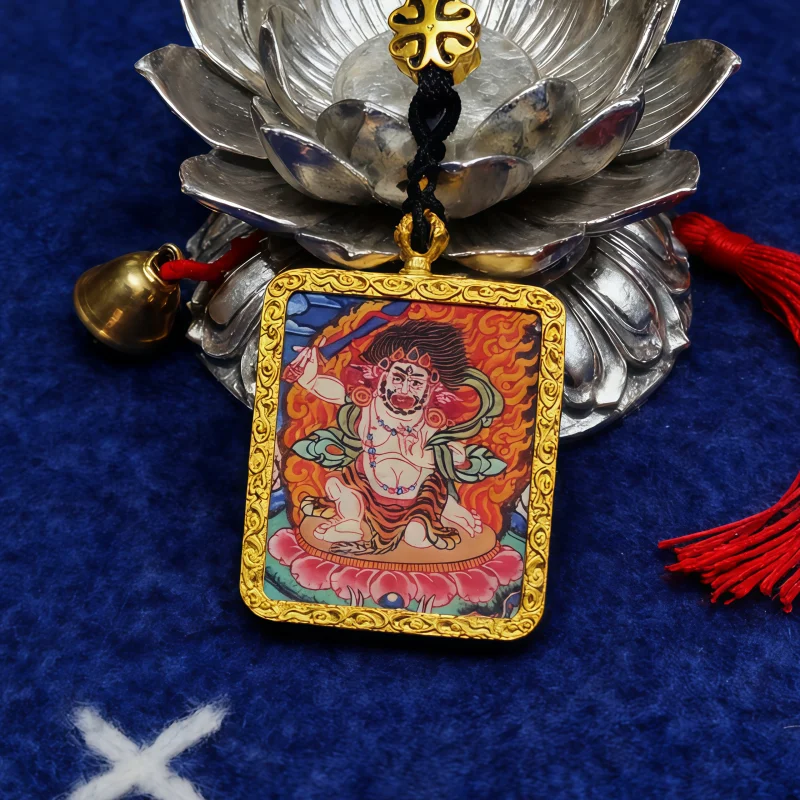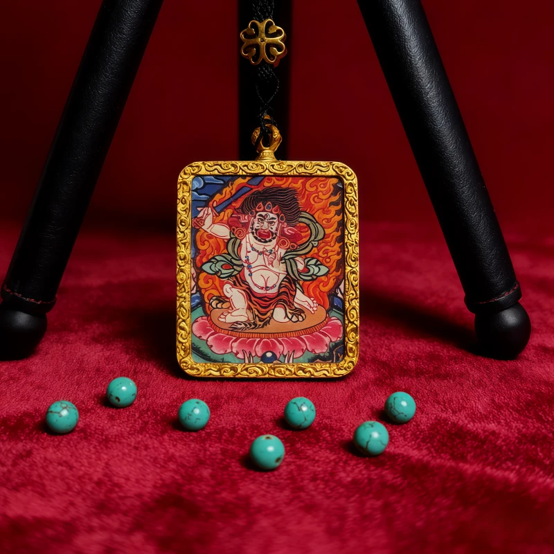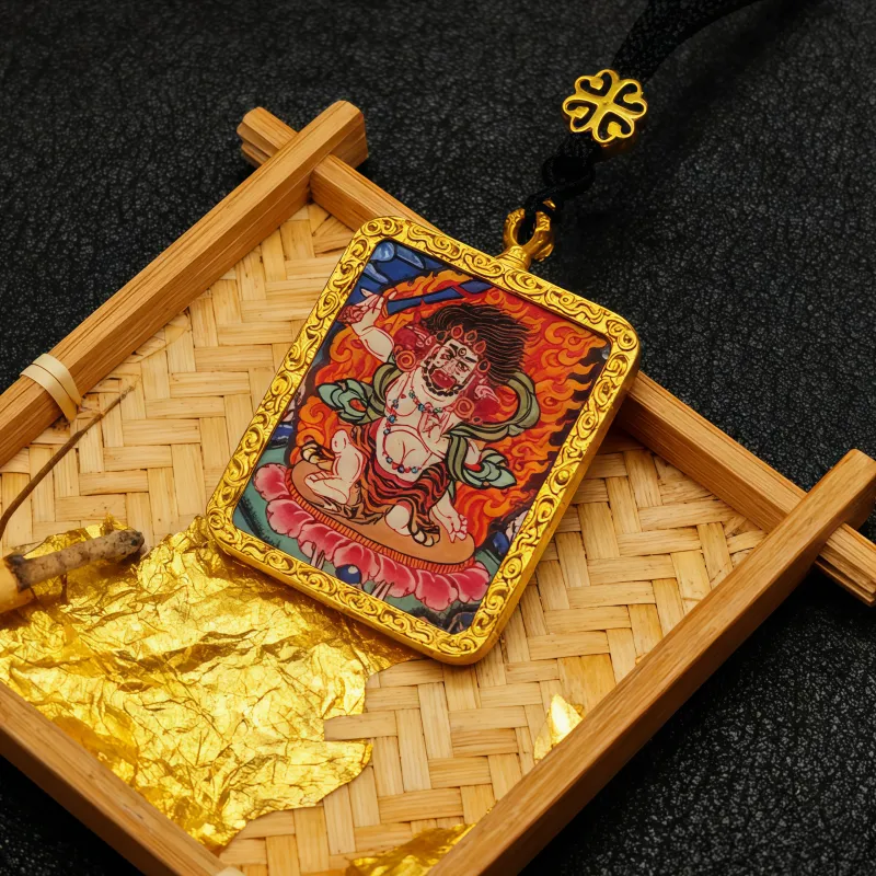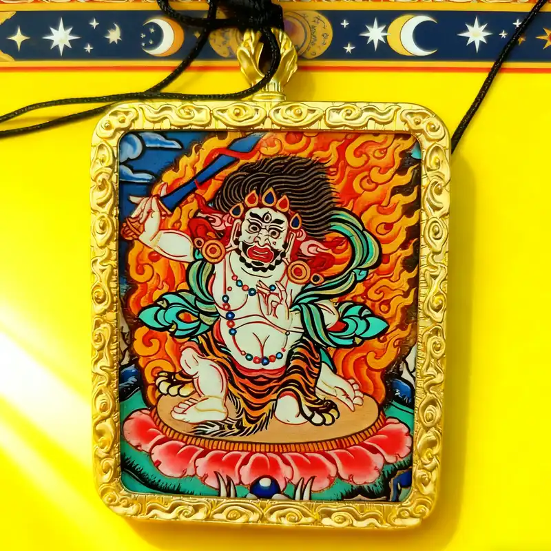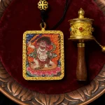 Acala symbolizes unwavering resolve, protection, and overcoming obstacles through spiritual wisdom. This Thangka pendant symbolizes Acala cutting through ignorance with the sword of wisdom and providing steadfast spiritual protection through his immovable form. It serves as a constant reminder of inner strength and determination. Many practitioners use it as a focal point for meditation to overcome challenges and maintain spiritual steadfastness.